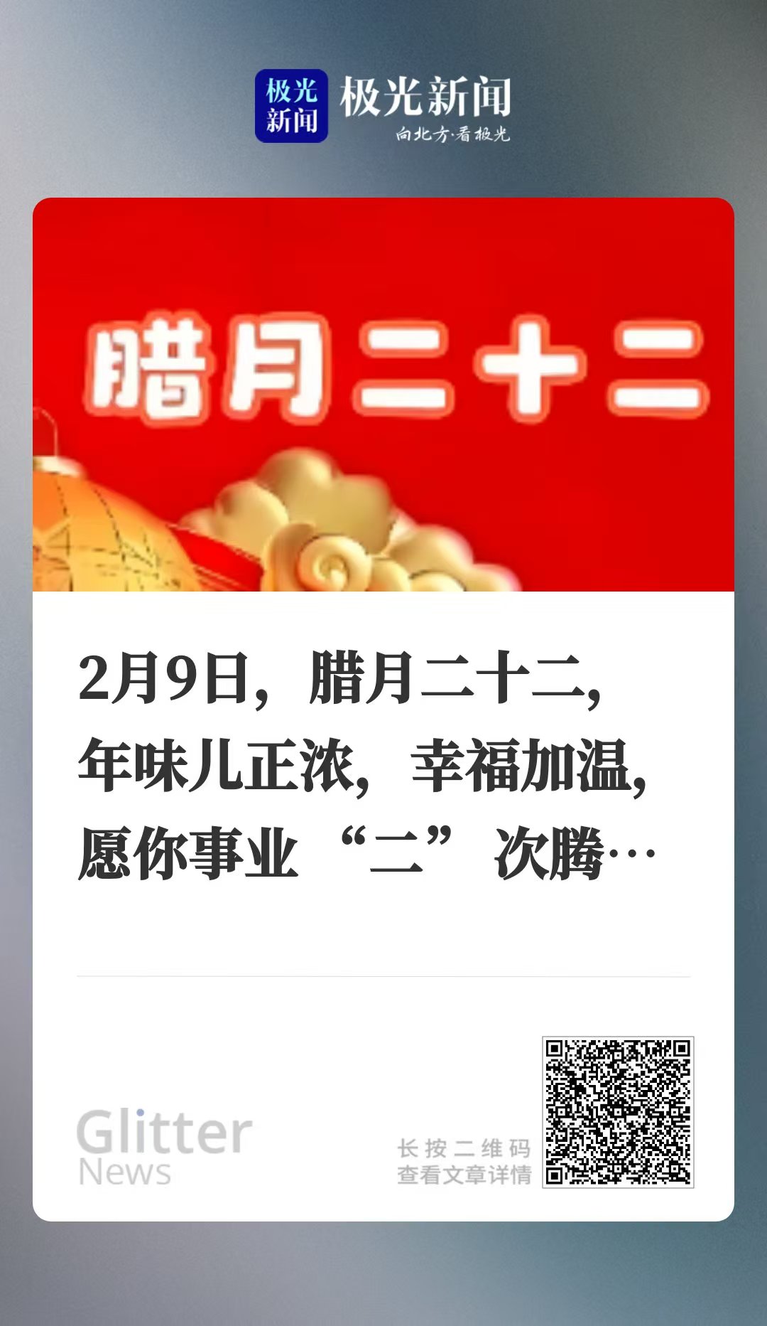 2月9日,腊月二十二,年味儿正浓,幸福加温,愿你事业 “二” 次腾飞,生活独一无 “二”